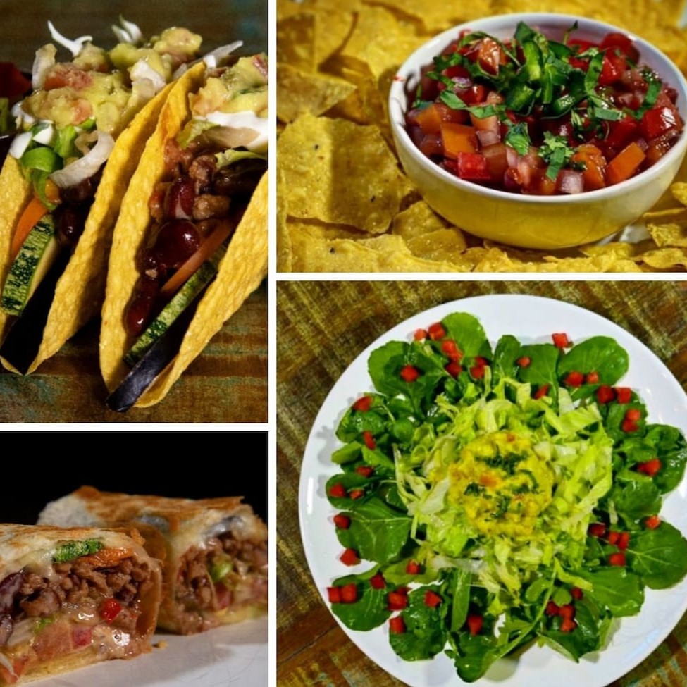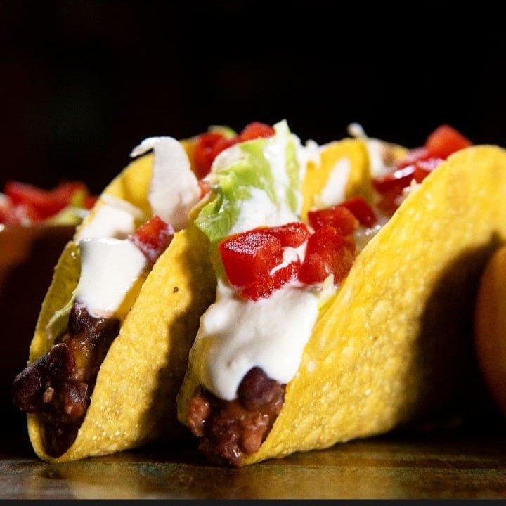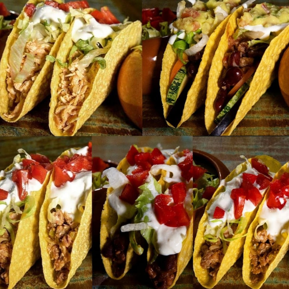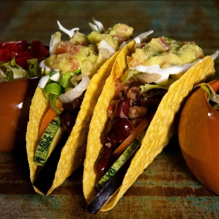 2 Tacos Crocantes, Chilli Vegetariano (Proteína de Soja), Legumes Grelhados (cenoura, abobrinha, berinjela), Guacamole, Sour Cream, Queijo, Alface e Tomate.