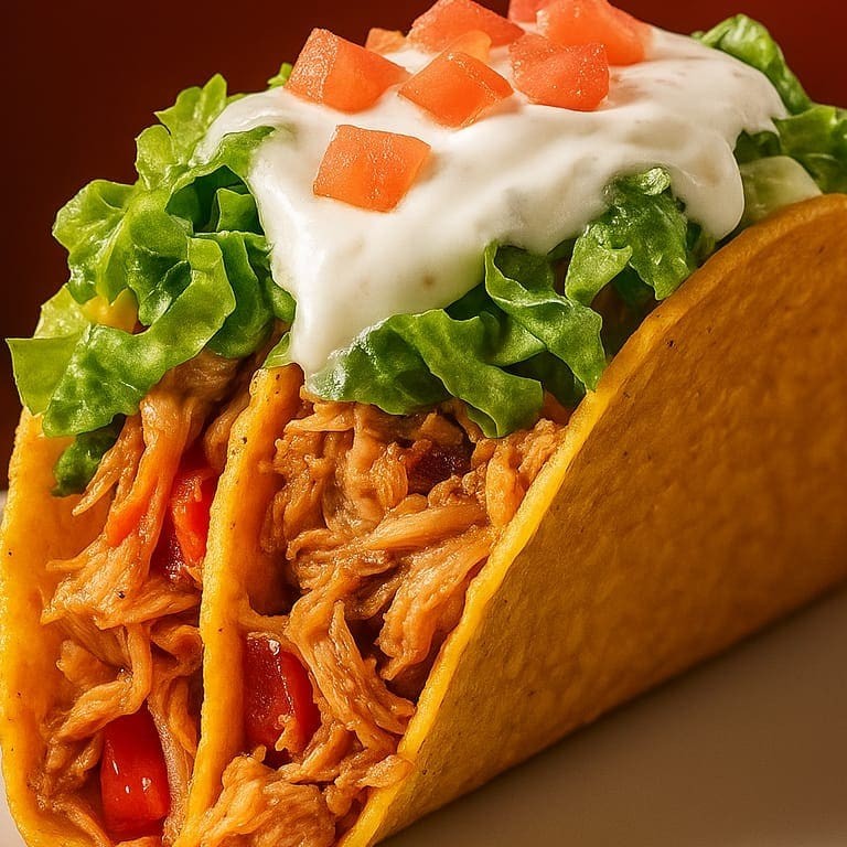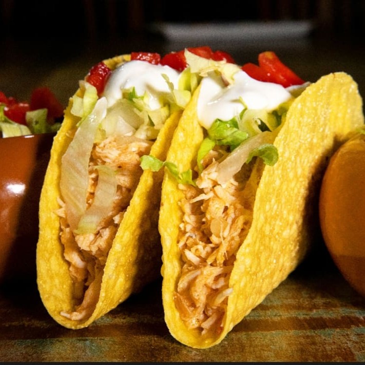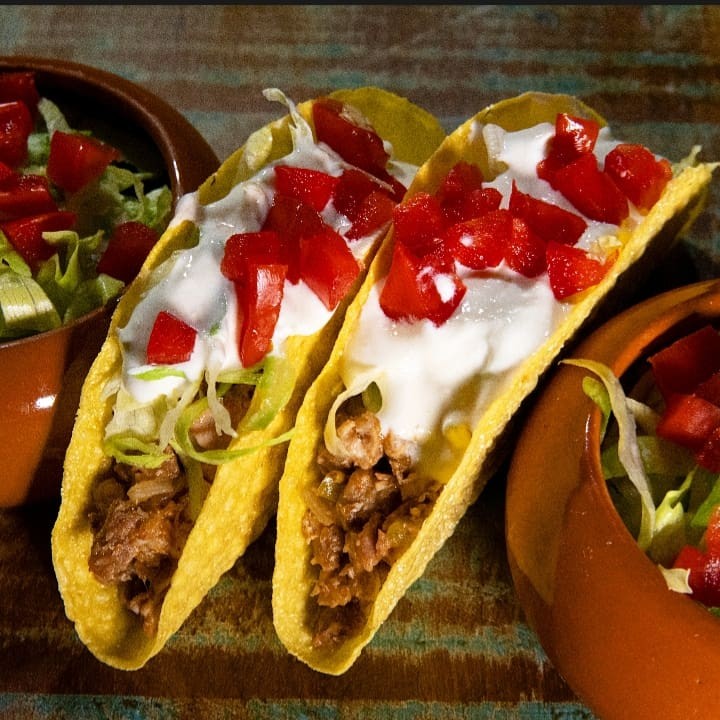 2 Tacos Crocantes, Pernil Desfiado, Queijo, Sour Cream, Alface e Tomate.