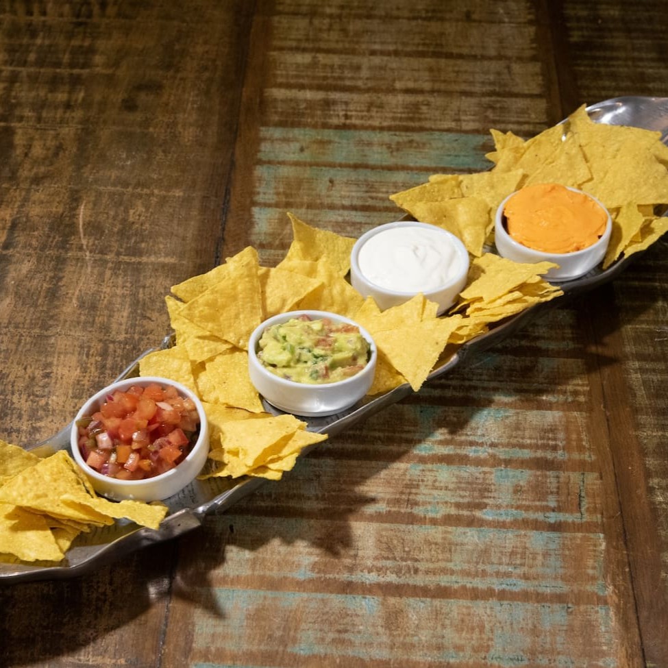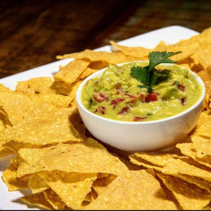 Porção de 300ml de Guacamole (abacate, tomate, cebola roxa, coentro, limão e temperos da casa) e porção de 90g de Nachos.