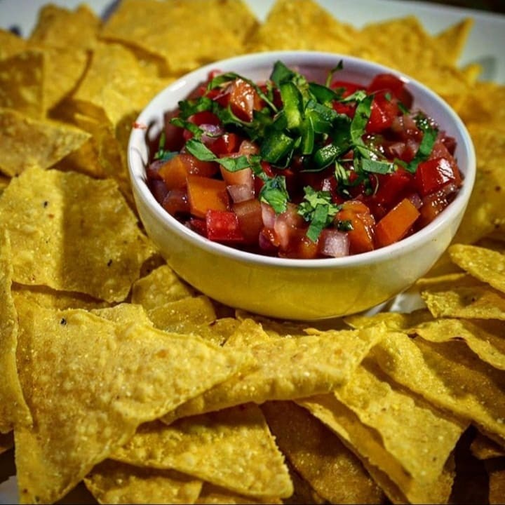 Porção de 90g de Nachos e porção de 300ml de Salsa Mexicana (tomate, cebola, coentro e temperos da casa).