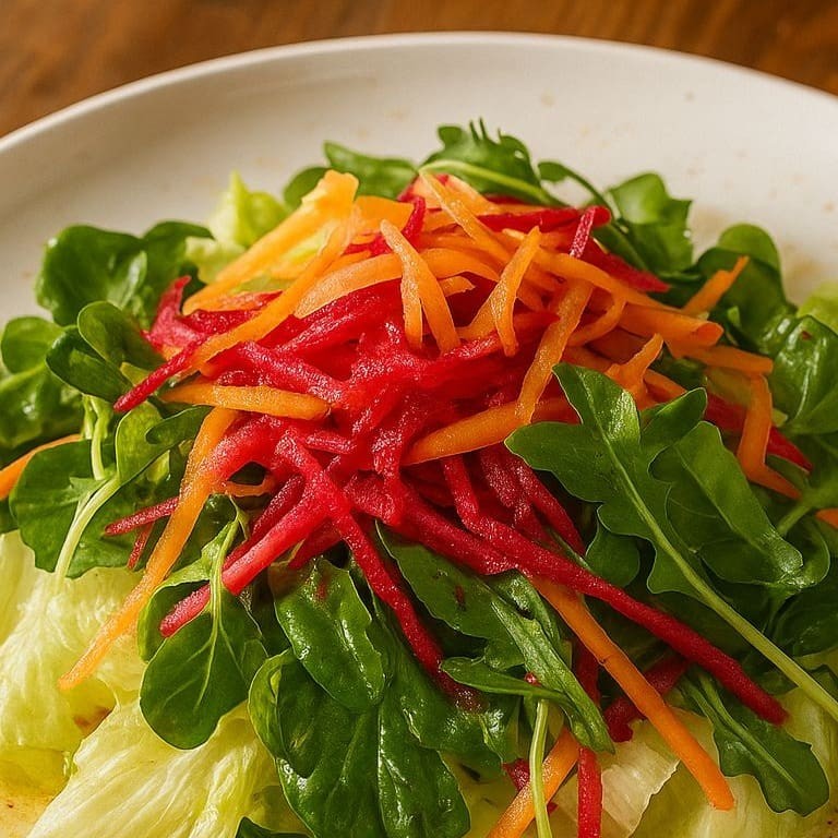 A salada para colorir e "resetar" o seu Dia. Um mix de folhas verdes, cenoura e beterraba, com toda a crocância e frescor dos ingredientes crus. O toque final é nosso molho de vinagre especial, leve e agridoce. Perfeita para quem busca uma refeição detox ou funcional. Mais vibrante que um suco verde, mais leve que qualquer lanche natural.