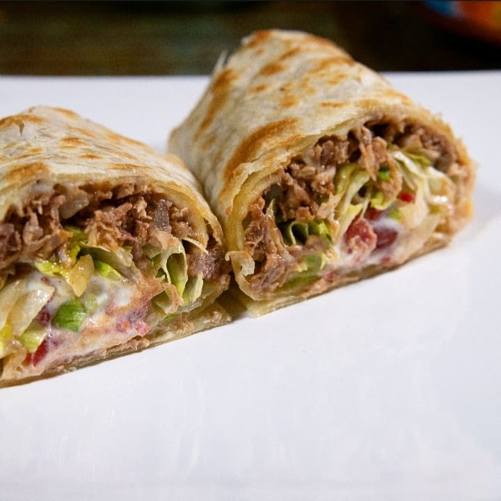 Ingredientes: Tortilla de trigo, pernil desfiado, queijo derretido, tomate, alface e sour cream artesanal.