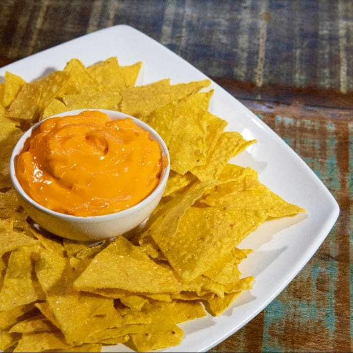 Porção de 90g de Nachos e porção de 300ml de Cheddar.