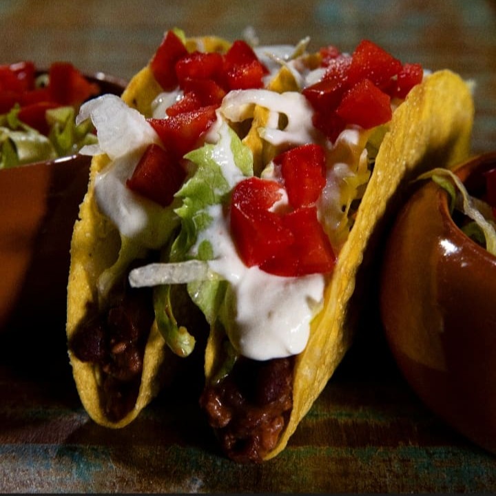 2 Tacos de Chilli: (Taco crocante, nosso famoso chilli de carne e feijão, queijo, alface, tomate e sour cream).