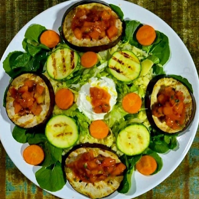 Mix de Folhas Nobres (rúcula, agrião, alface), Legumes Grelhados (berinjela, abobrinha, cenoura), Queijo Ralado e Sour Cream.