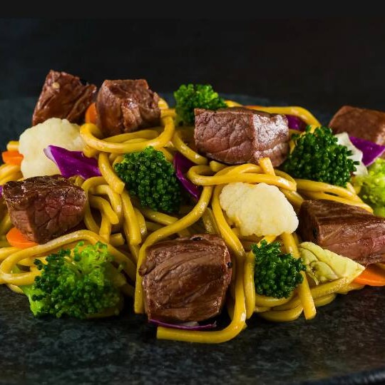 Macarrão oriental com carne e legumes no molho a base de shoyo .