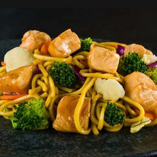 Macarrão carne ,frango e legumes com molho especial a base de shoyo