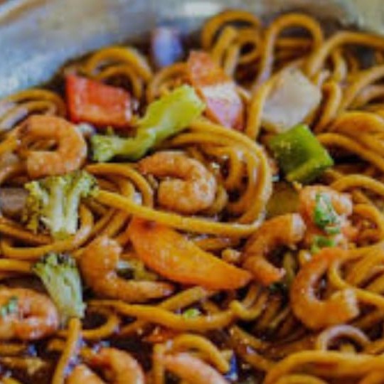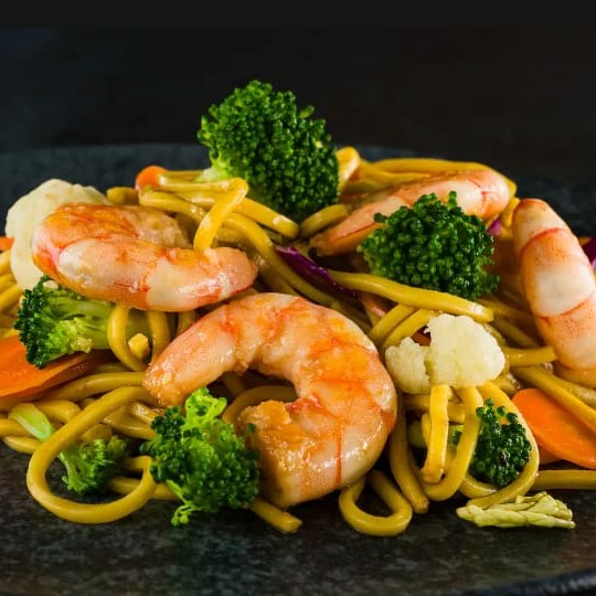 Macarrão carne frango camarão e legumes no molho especial a base de shoyo