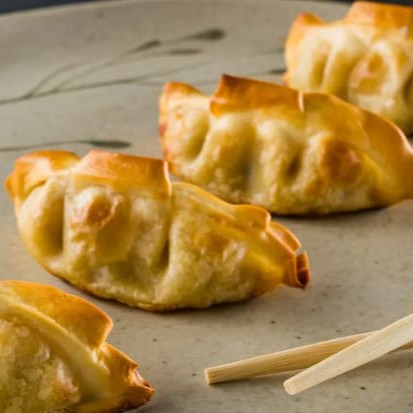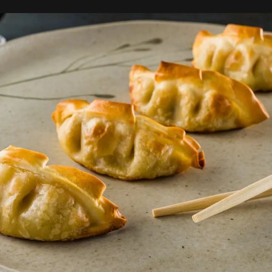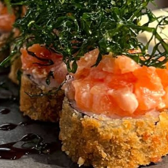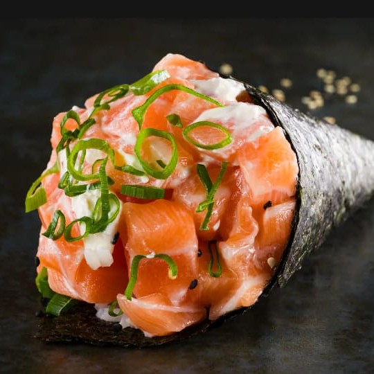 10 unidades de hot com creme cheese e salmão cru batido por cima finalizado com crisp de couve