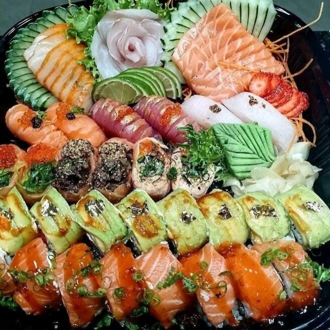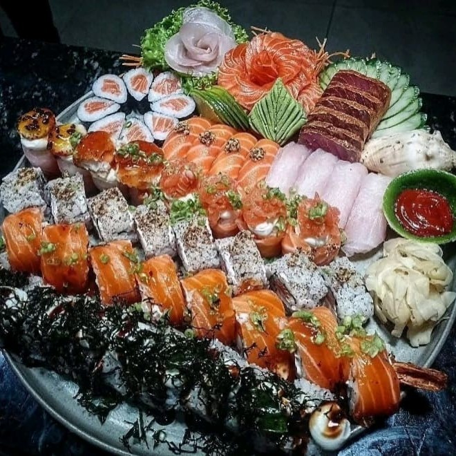 Arroz , Salmão , Cerviche ,Sunomono , Tomate Cereja , Batata Crisp E Creme Cheese