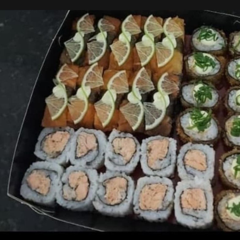 25 peças. 10 uramaki salmão grelhado 10 hot tradicional 5 niguiri skin lemon