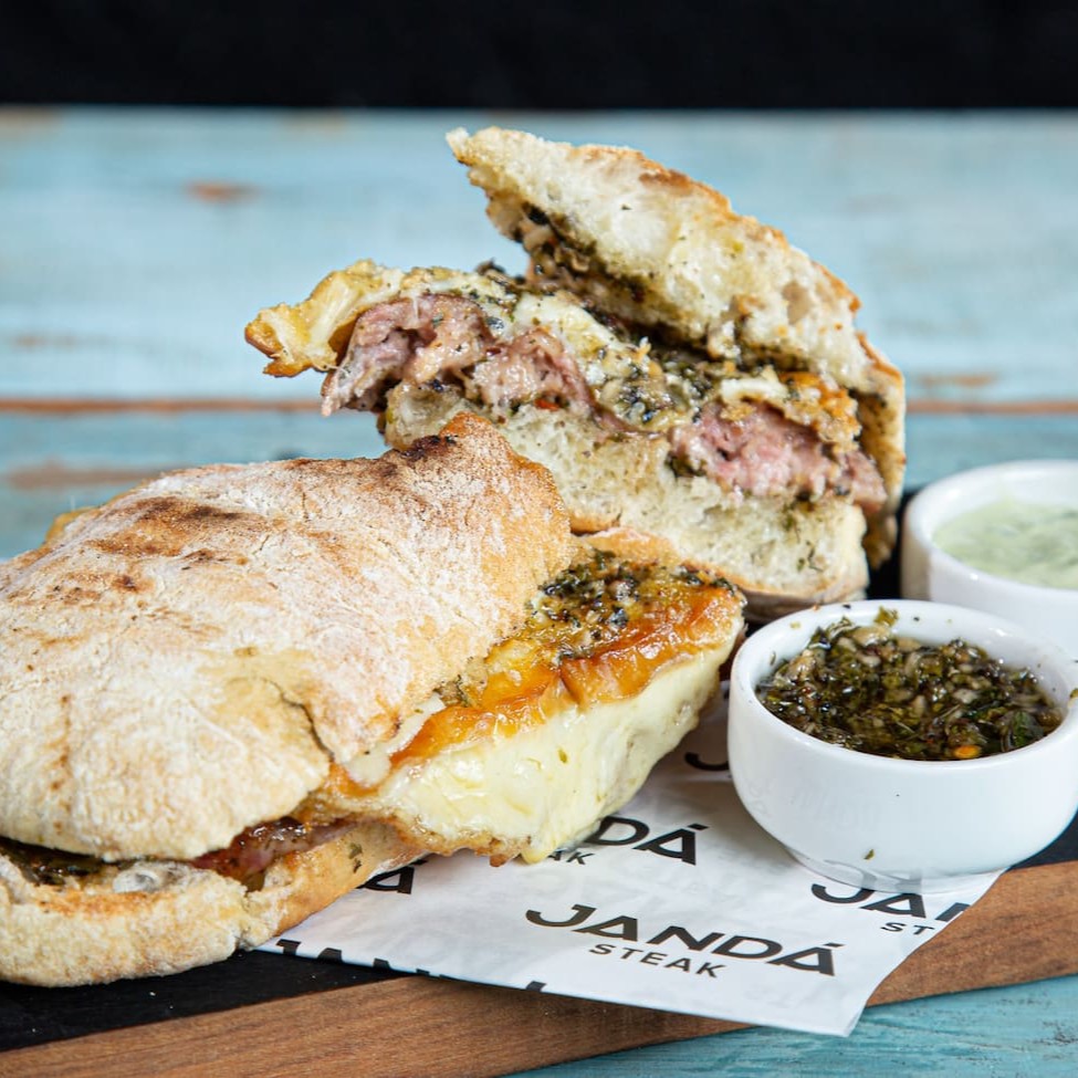 Sanduíche servido no pão ciabatta, recheado com linguiça toscana caseira, chimichurri, maionese de ervas e uma generosa fatia de queijo provolone. Acompanha batata frita.