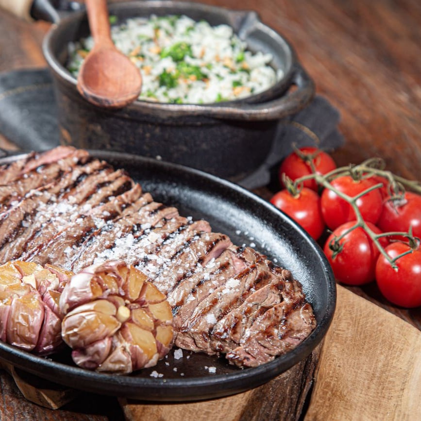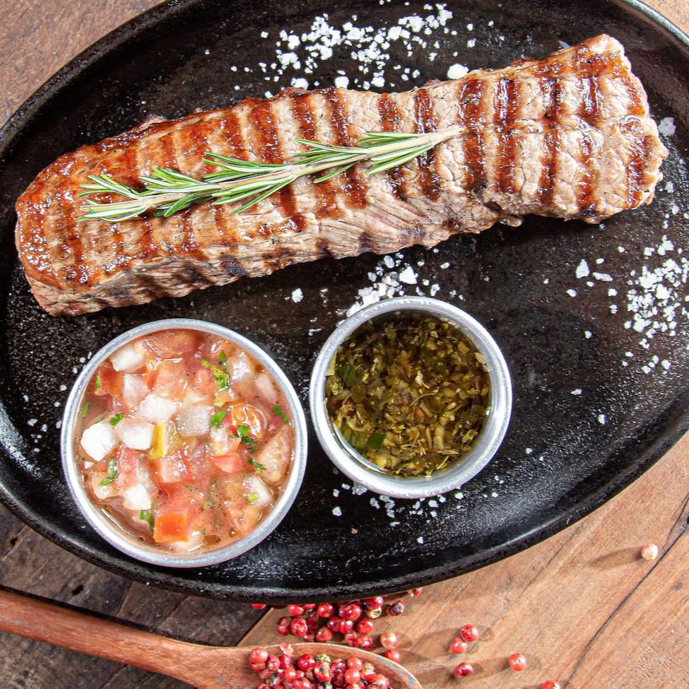 Diretamente da alma das parrillas Argentinas, o bife de chorizo é aquele corte suculento e cheio de personalidade. Por conta do seu sabor marcante, é a principal escolha dos nossos hermanos quando o assunto é carne de verdade. Acompanha vinagrete e chimichurri. Obs: Carnes pesadas in natura, podendo haver variação na gramatura.