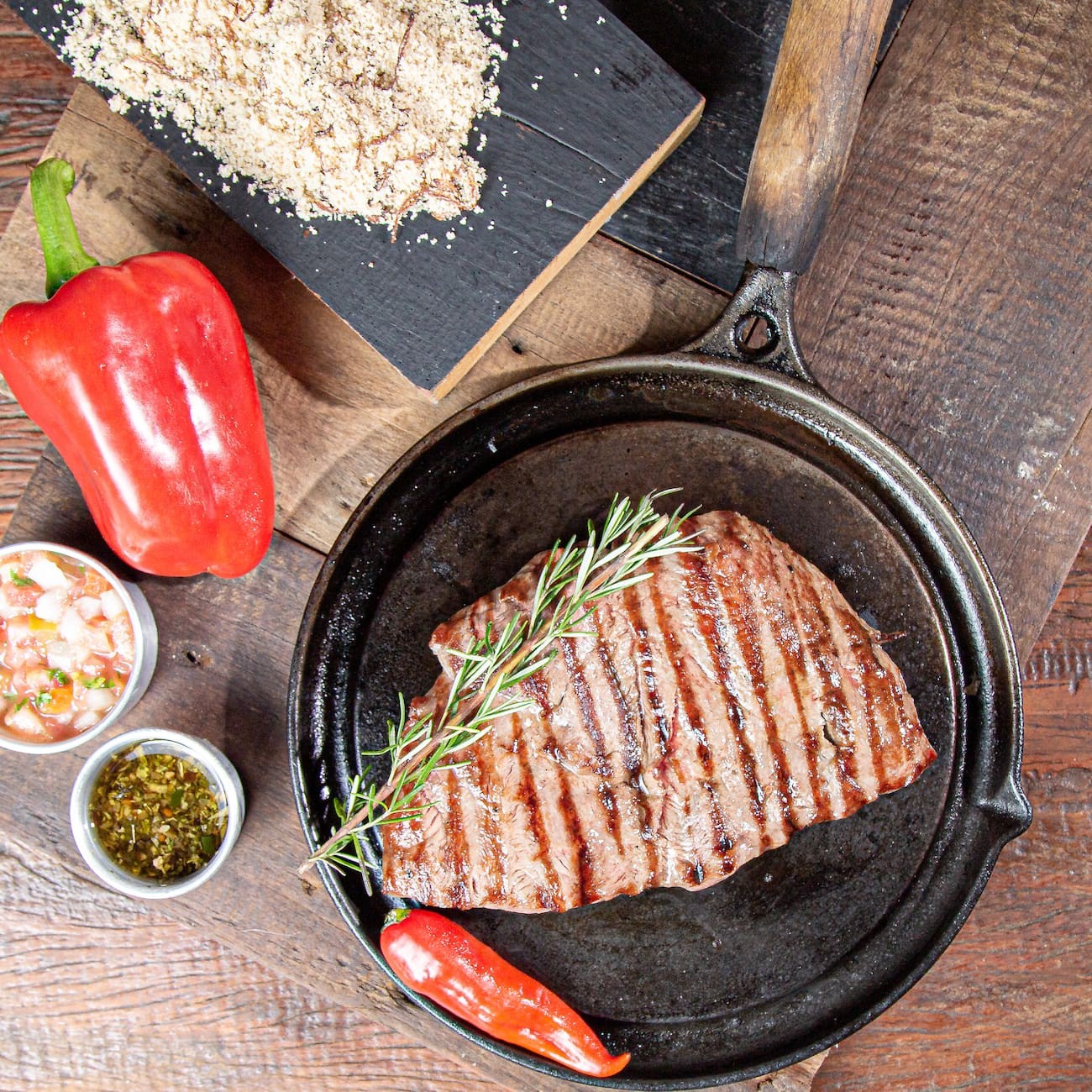 Corte clássico, suculento e com fibras marcantes. A fraldinha vem direto da parte inferior do boi, onde o sabor é intenso e a maciez surpreende. Uma explosão de sabor a cada garfada. Acompanha vinagrete e chimichurri. Obs: Carnes pesadas in natura, podendo haver variação na gramatura.