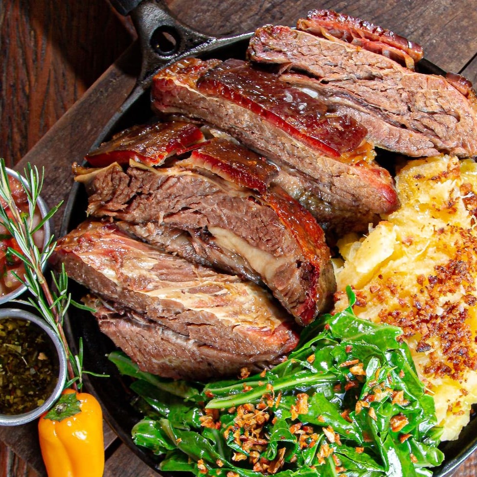 Um dos pratos que mais vendem na casa completo em um super combo. Costela asada no bafo por 7 horas, mandioca cozida desmanchando regada com farofa de bacon, couve rasgada e refogada, arroz biro-biro, farofa crocante da casa, vinagrete, chimichurri + 01 bebida a sua escolha.