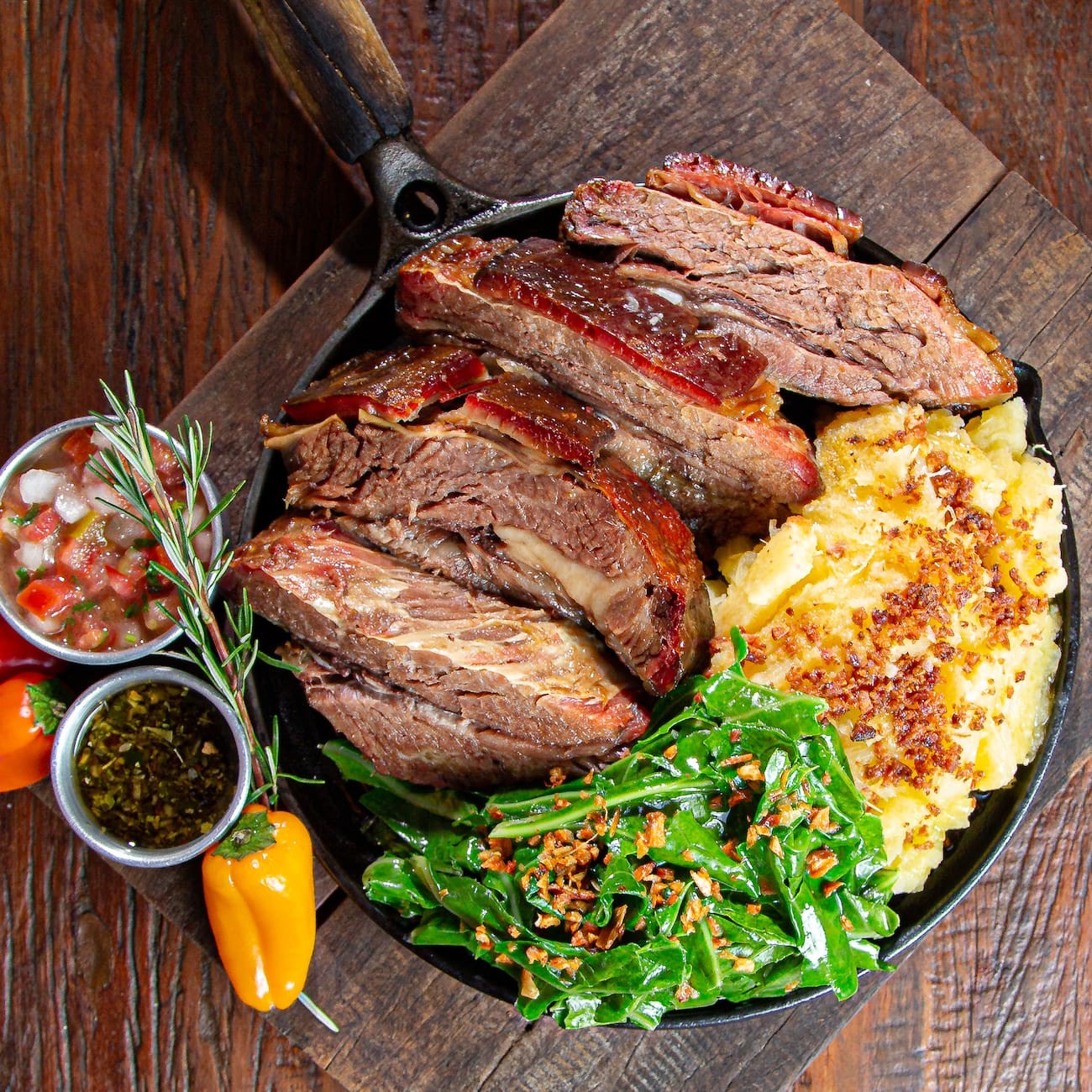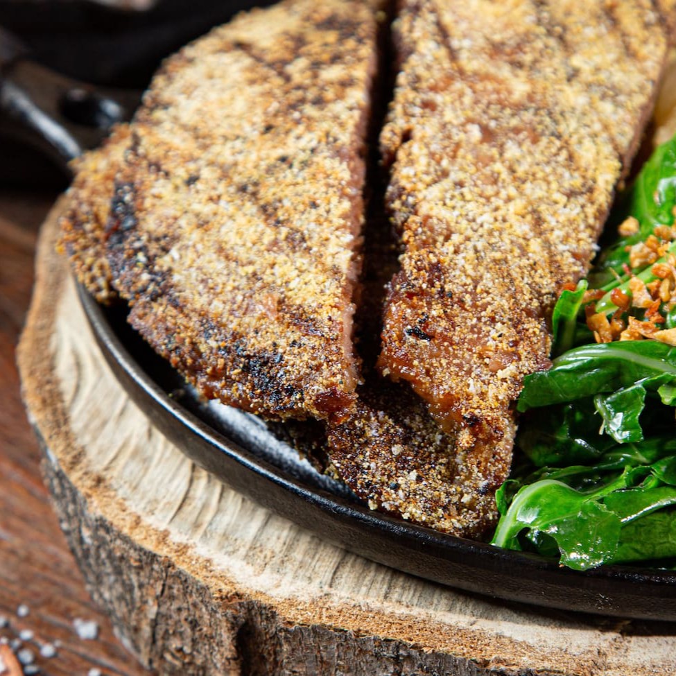 O mais pedido da casa. Casquinha crocante e extremamente macio por dentro. Acompanha mandioca cozida, couve refogada, chimichurri e vinagrete.