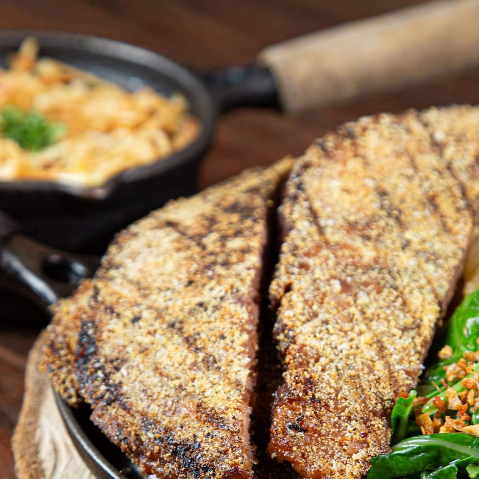 A estrela, o mais pedido, o queridinho dos clientes. O cupim é assado lentamente até chegar em uma maciez inigualável pra depois ser finalizado com um tempera especial que faz com que ele fique com uma casquinha crocante. Acompanha mandioca cozida regada com farofa de bacon e couve rasgada refogada, vinagrete e chimichurri.