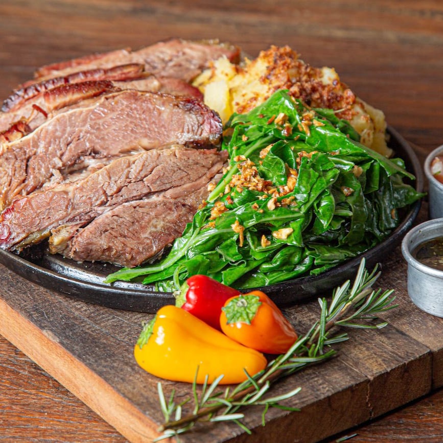 Especialidade da casa. Nossa costela assa por volta de 7hrs até atingir um equilíbrio entre maciez, sabor e suculência. Acompanha mandioca cozida, couve refogada, vinagrete e chimichurri.