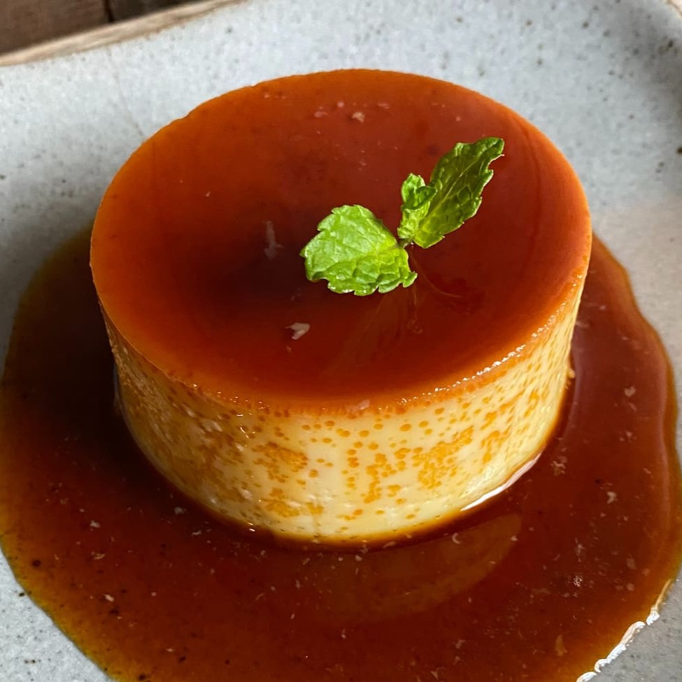 Pudim de leite artesanal e caseiro, feito no próprio local.