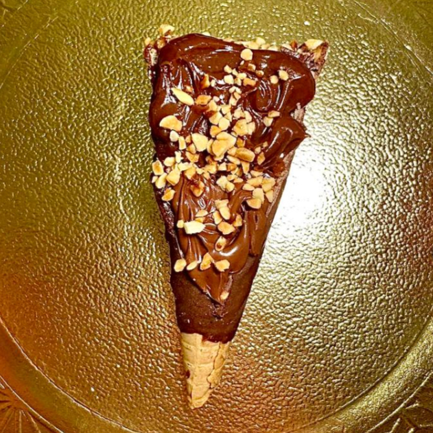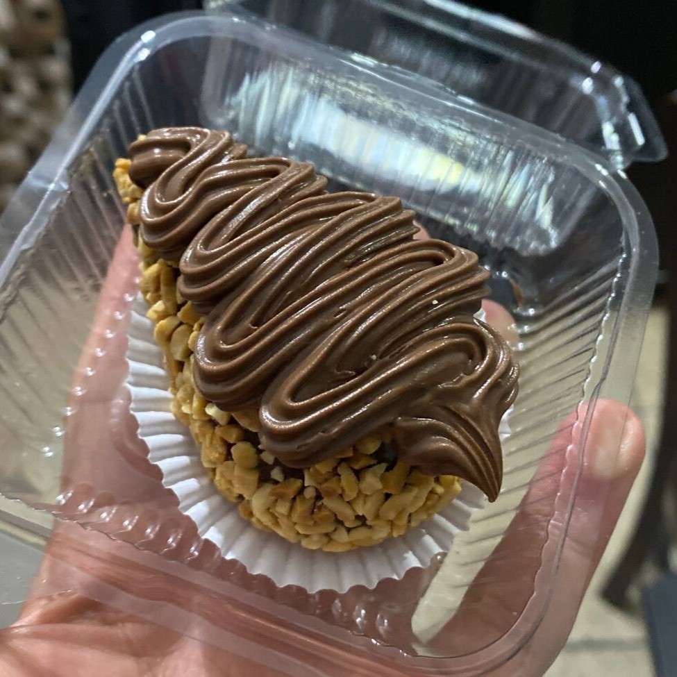 Casquinha crocante banhada no chocolate ao leite e recheio de briagdeiro ao leite, nutella e amendoim.