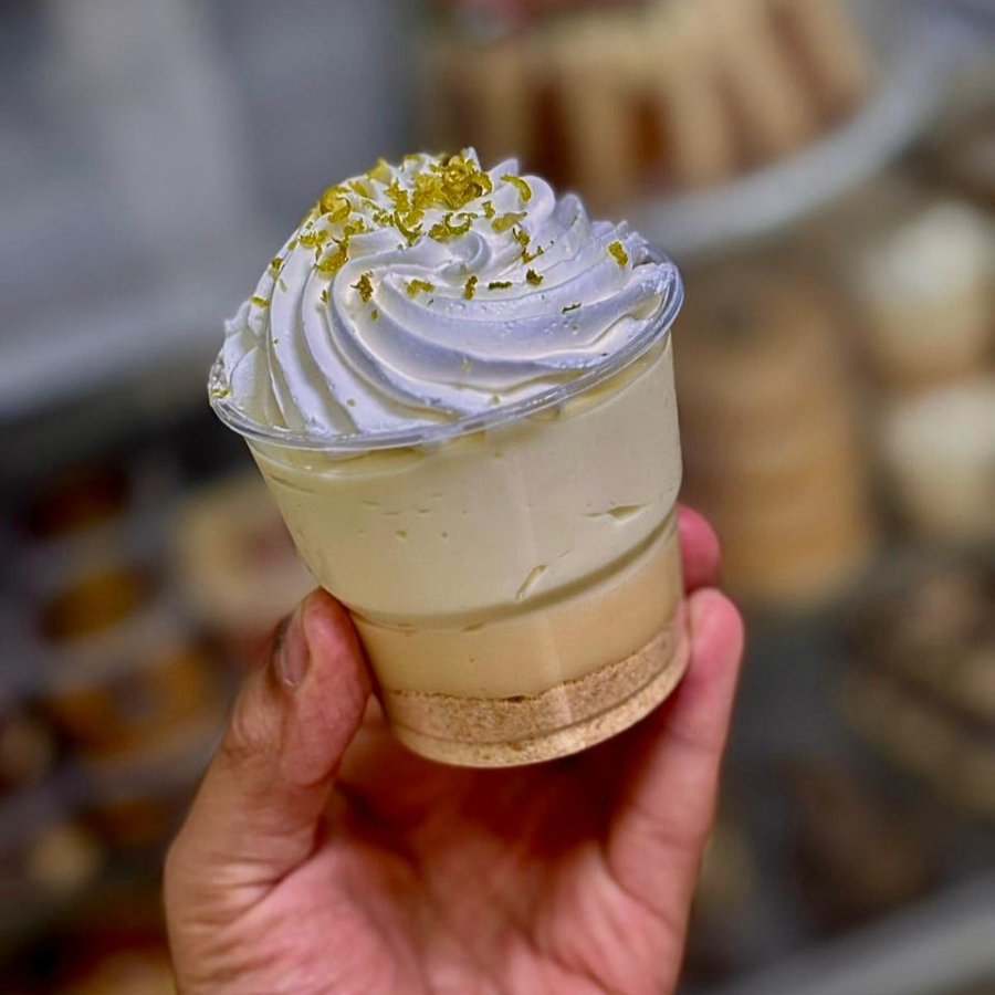 Bolacha maizena triturada, brigadeiro de ninho, mousse de limão, finalizado com chantilly e raspas de limão.