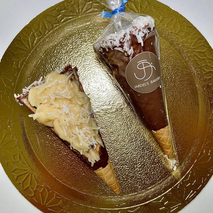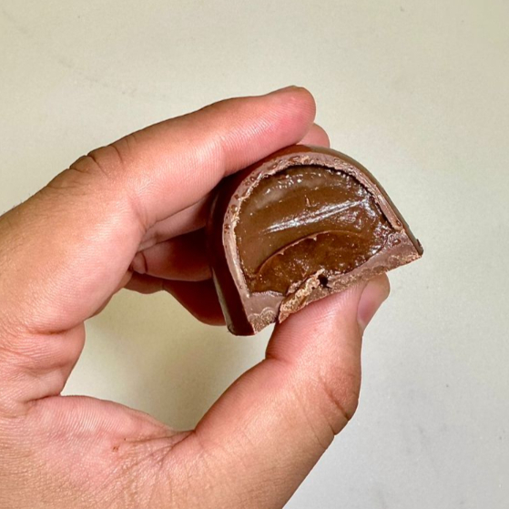 Casquinha crocante coberta de chocolate ao leite e recheio de brigadeiro ao leite.