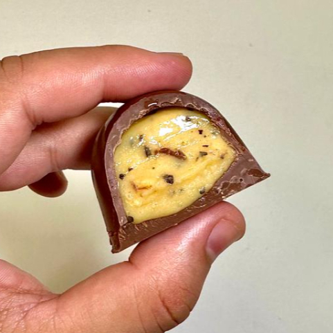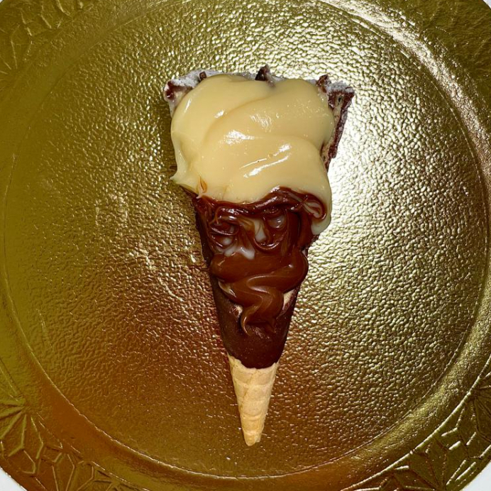 Casquinha crocante banhada c/ chocolate ao leite e recheio de brigadeiro de ninho e nutella.