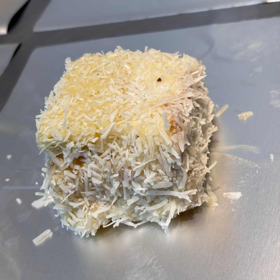 Uma massa branca molhadinha com uma calda 4 leites, recheio de coco, finalizado no coco ralado.