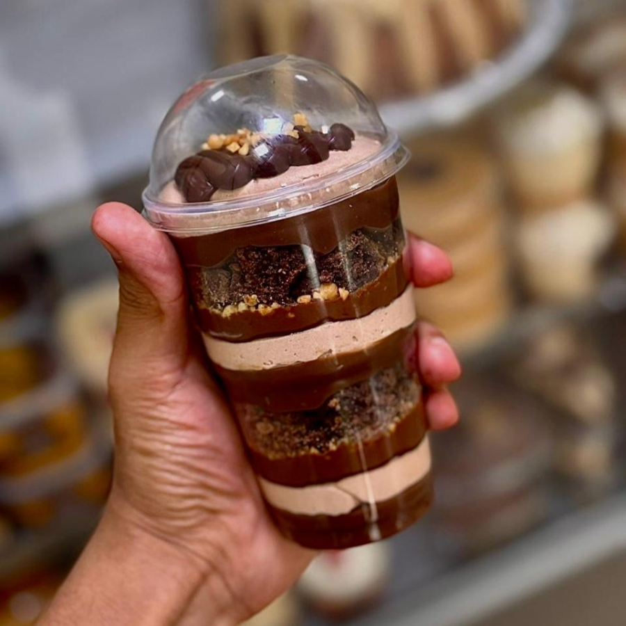Brigadeiro ao leite, mousse de chocolate ao leite, nutella, amendoim e brownie.
