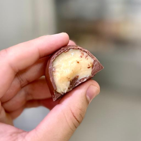 Morango dentro da massa de chocolate ao leite e granulé ao leite.