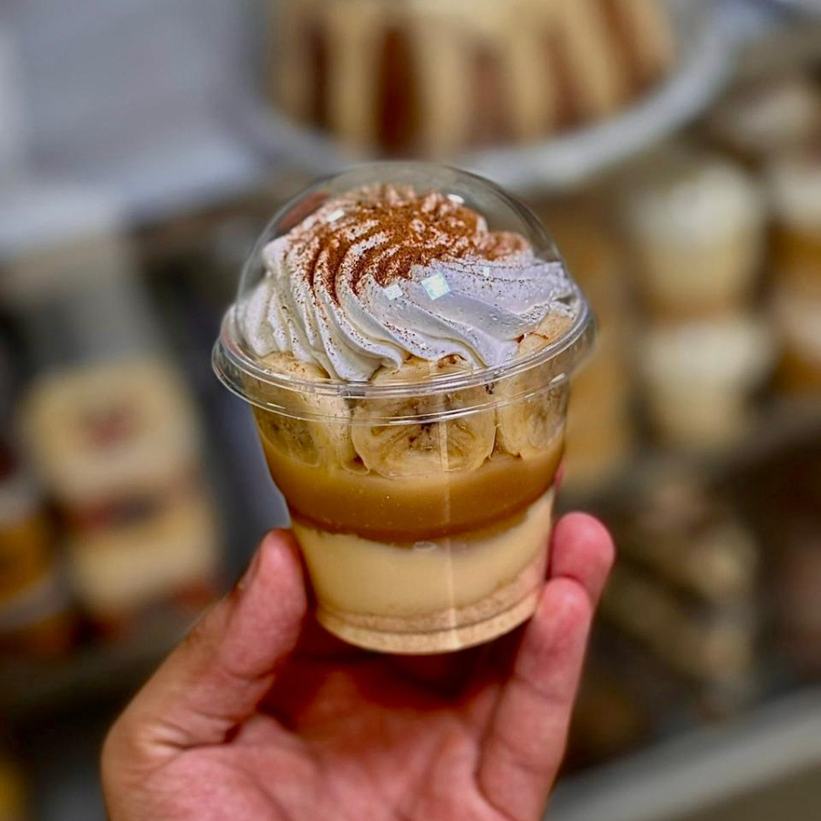 Bolacha maisena triturada, brigadeiro de ninho, doce de leite, banana finalizado c/ chantilly e canela em pó.