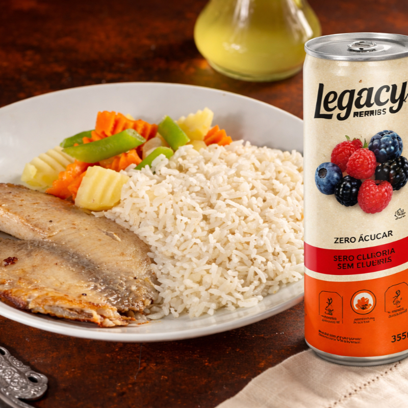 Prato completo e equilibrado, composto por filé de peixe grelhado, arroz branco soltinho e legumes cozidos no ponto certo. Acompanha uma lata de Energy Drink Legacy Fresh Berries 355ml, zero açúcar, zero caloria e sem glúten. Uma refeição leve, nutritiva e ideal para quem busca saciedade com energia e praticidade no dia a dia.