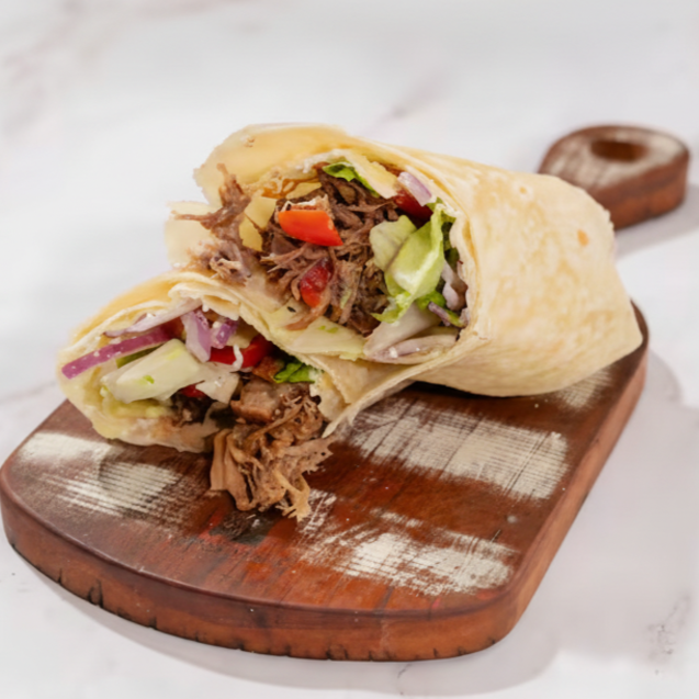 Nosso wrap de carne de porco desfiada é uma delícia! Carne suculenta e temperada, envolvida em uma tortilla leve e fresca. Perfeito pra um almoço rápido e cheio de sabor.