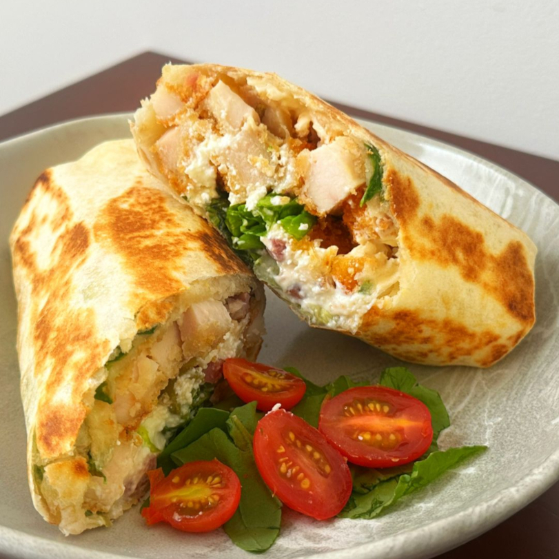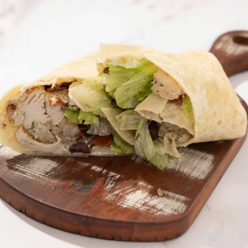 Wrap de frango empanado a milanesa, mix de folhas, tomate, azeitona, bacon e maionese defumada.