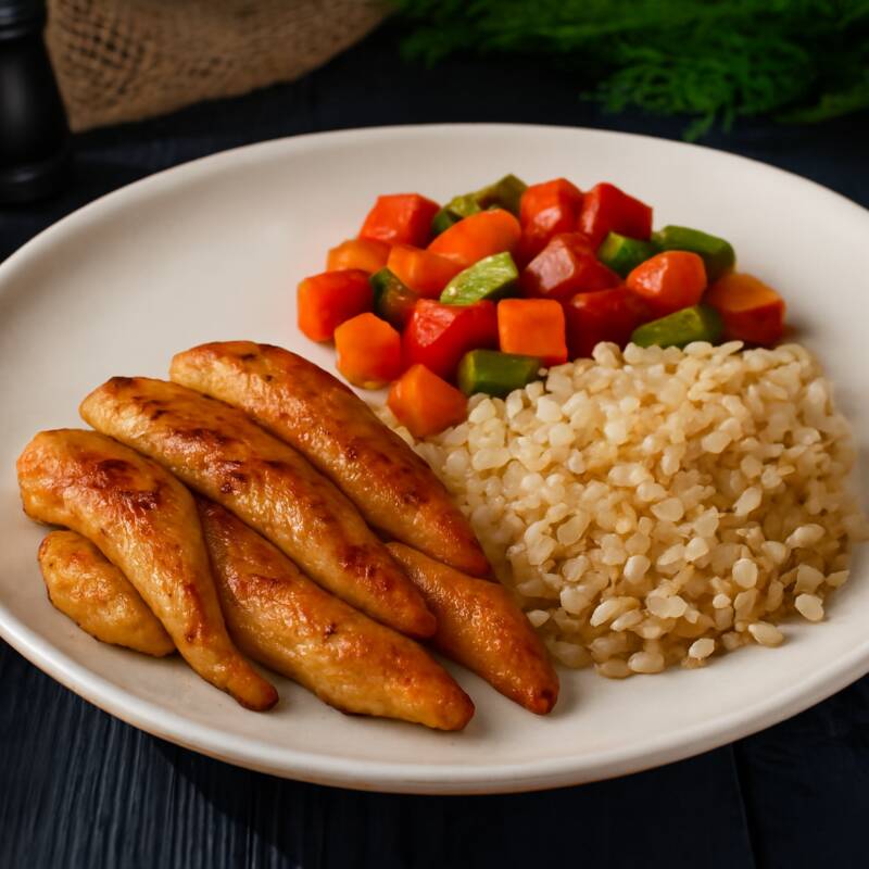 Delicie-se com nosso novo prato! Arroz integral, iscas de frango macias e legumes defumados com um toque especial. Uma explosão de sabores em cada garfada!