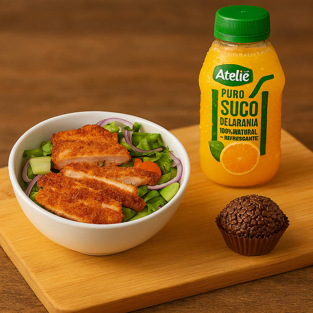Leve e saboroso! Nossa Salada de Frango Crispy vem com alface fresca, tomate cereja e o crocante irresistível do frango empanado. Para acompanhar, um refrescante Suco de Laranja Ateliê, feito na hora, natural e cheio de energia. E pra fechar com chave de ouro, um delicioso Brigadeiro Belga 70%, cremoso e com aquele toque sofisticado do chocolate meio amargo.