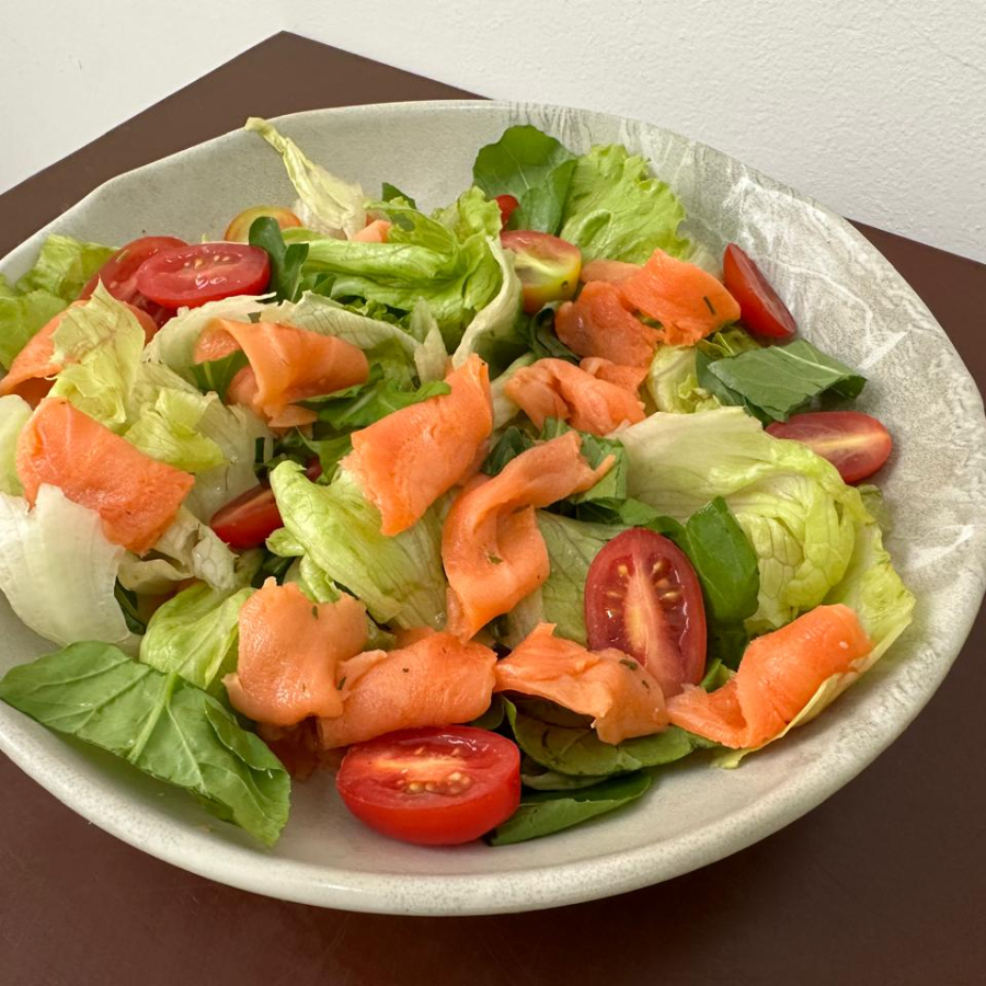 Salada fresca e equilibrada com 100g de salmão suculento, mix de folhas verdes (rúcula, alface americana e agrião) e tomates-cereja que dão um toque especial. Leve e irresistível!