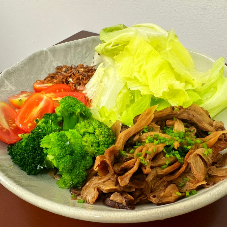 Uma deliciosa salada nutritiva preparada com cogumelos salteados, folhas frescas de salada americana, tomates-cereja suculentos e brócolis crocantes. Finalizada com uma irresistível cebola crispy que adiciona textura e sabor a cada garfada. Leve, saborosa e perfeita para quem busca uma refeição equilibrada e cheia de frescor.