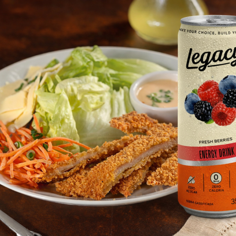 Salada fresca e equilibrada, composta por tiras de frango empanado crocante, alface americana, cenoura ralada e lascas de queijo, acompanhada de molho cremoso à parte. Para completar, uma lata de Energy Drink Legacy Fresh Berries 355ml, zero açúcar, zero caloria e sem glúten. Um combo leve, saboroso e ideal para quem busca energia sem abrir mão do equilíbrio.