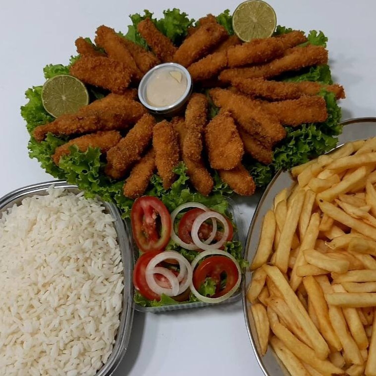 Acompanha arroz, batata frita, salada e molho da casa