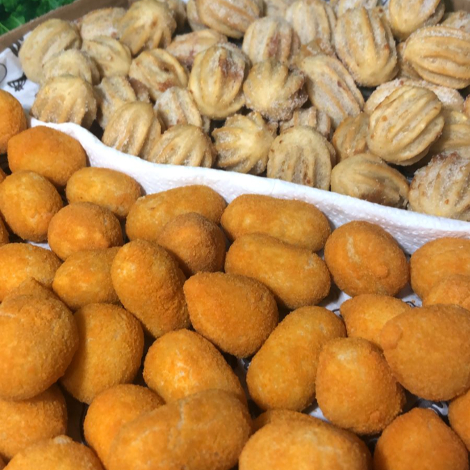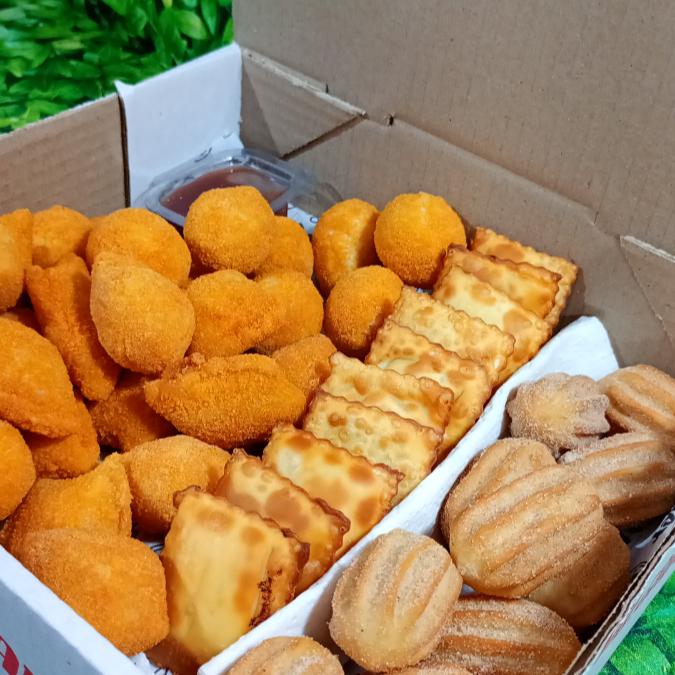 30 unidades de mini salgados fritos sortidos + 20 unidades de mini pasteizinhos sortidos