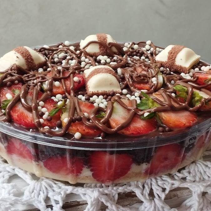 A Travessa Ninho com Morangos é um deleite para os amantes de sobremesas. A base é composta por um bolo branco incrivelmente úmido, que se derrete na boca. Este bolo é generosamente regado com um brigadeiro gourmet cremoso feito com leite Ninho, elevando a sobremesa a um novo patamar de sabor. Morangos picados são adicionados, trazendo uma doçura frutada e uma suave acidez que contrasta de forma perfeita com o doce. A cobertura é um chantilly luxuosamente aerado, polvilhado com leite em pó para um toque extra de sabor e textura. Finalizando a travessa, morangos frescos são delicadamente colocados, acrescentando cor e frescor. Disponível nos tamanhos P e G, essa sobremesa é perfeita para compartilhar em ocasiões especiais ou simplesmente para se deliciar sozinho.
