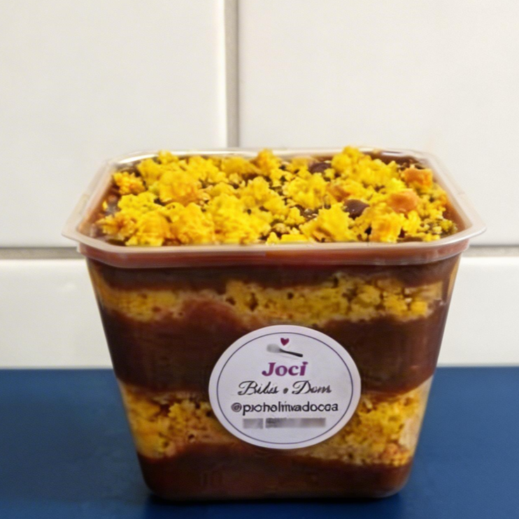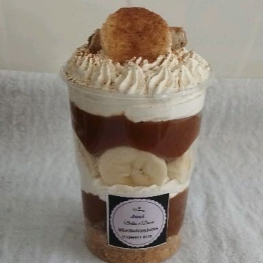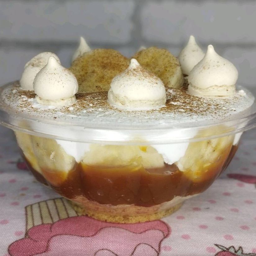 Farofinha, Doce de Leite Cremoso, Bananas picadas e Chantilly. Finalizada com banana, suspiros e canela em pó. (Pote com 250 ml)