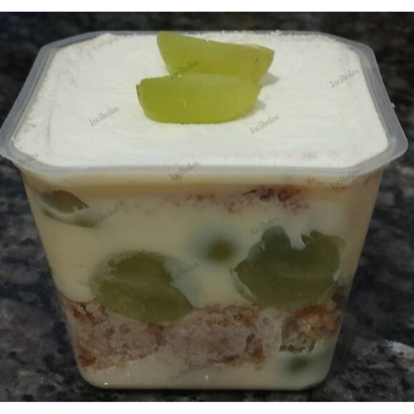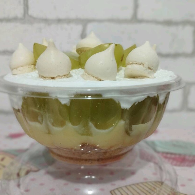 Farofinha, Brigadeiro gourmet de Leite Ninho, Uvas Verdes picadas e Chantilly. Finalizado com suspiros e uvas. (Pote 250ml)