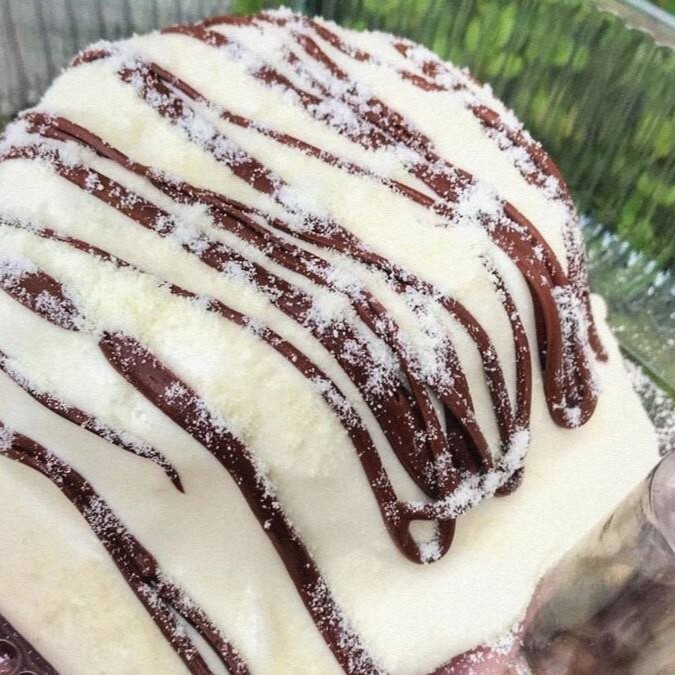 Bolo branco caseiro fofinho com cobertura de brigadeiro gourmet de leite Ninho e riscos de Nutella.