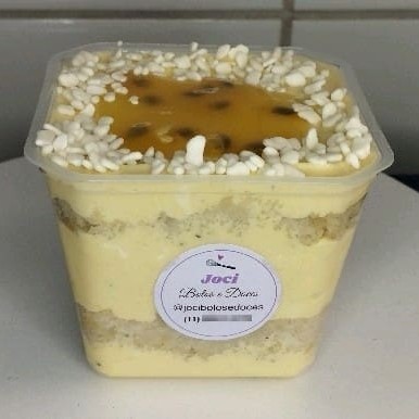 Sedutor Bolo no Pote de Maracujá, da categoria Bolo no Pote (250 ml). Uma combinação perfeita de bolo branco ultra macio e suculento, generosamente embebido em uma calda caseira de maracujá, criando um equilíbrio perfeito de doçura e acidez. A coroação deste deleite é uma mousse de maracujá aveludada, que adiciona uma textura luxuosa e um sabor refrescante. Este bolo no pote é irresistivelmente de