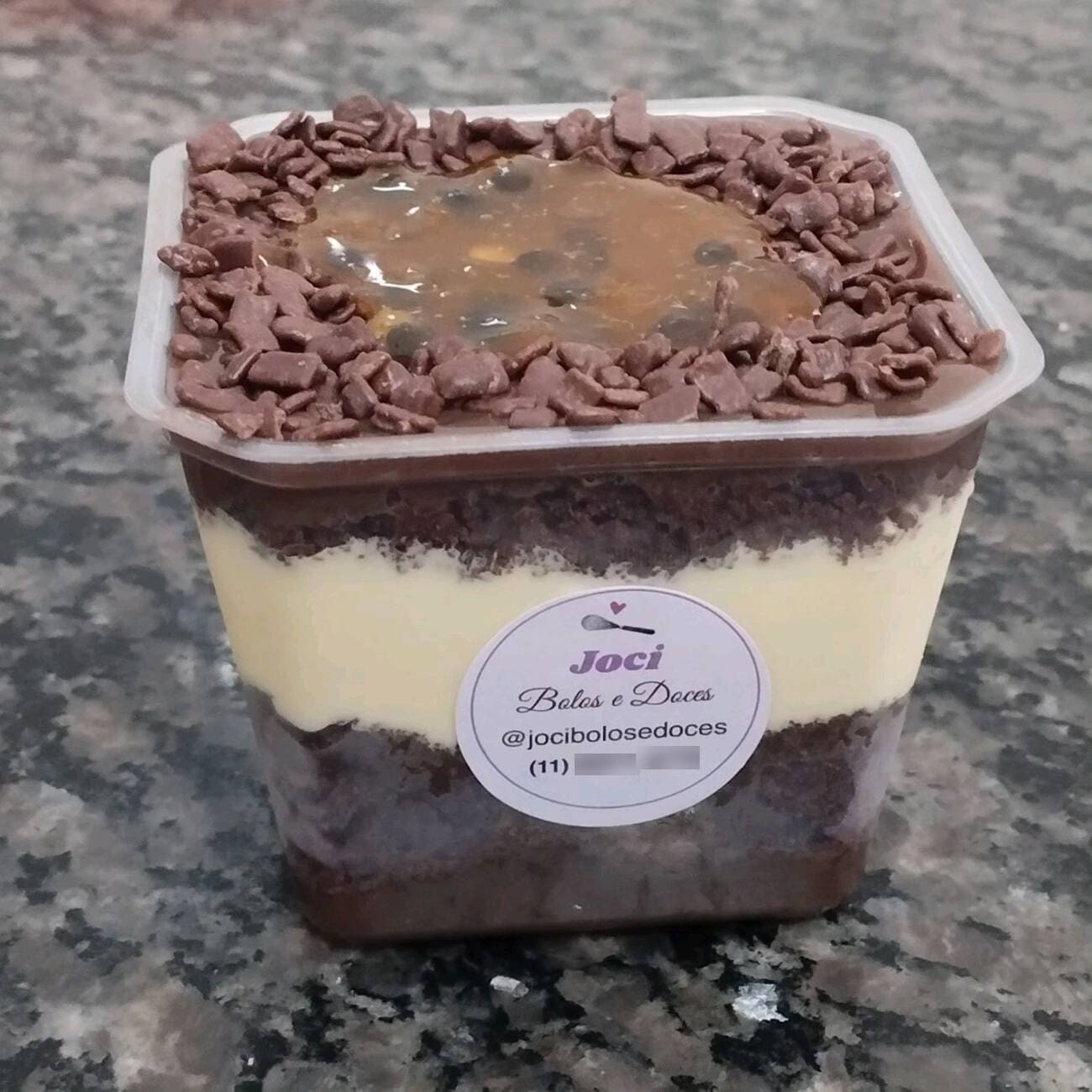 O 'Bolo no Pote Maracolate' é uma refinada composição de sabor e textura. Este requintado bolo de chocolate, meticulosamente preparado, é surpreendentemente úmido e aveludado. Acompanha um irresistível brigadeiro gourmet de chocolate, cuja riqueza de sabor mescla-se harmonicamente com o bolo. O toque final é uma exótica e refrescante mousse de maracujá, trazendo um equilíbrio perfeito de doçura e