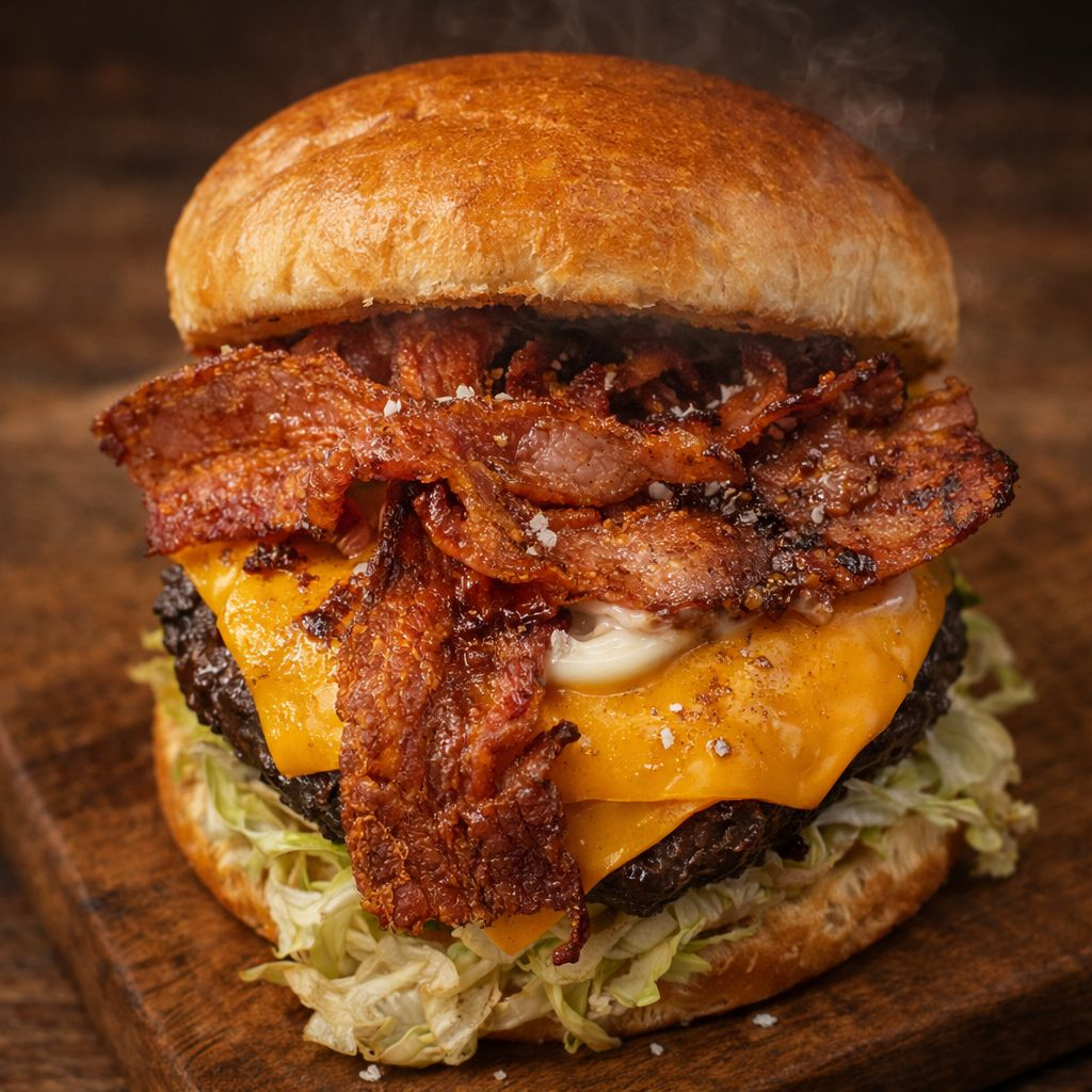 Pão brioche selado na brasa, carne bovina 150g, bacon defumado, queijo cheddar, alface tomate e cebola roxa.