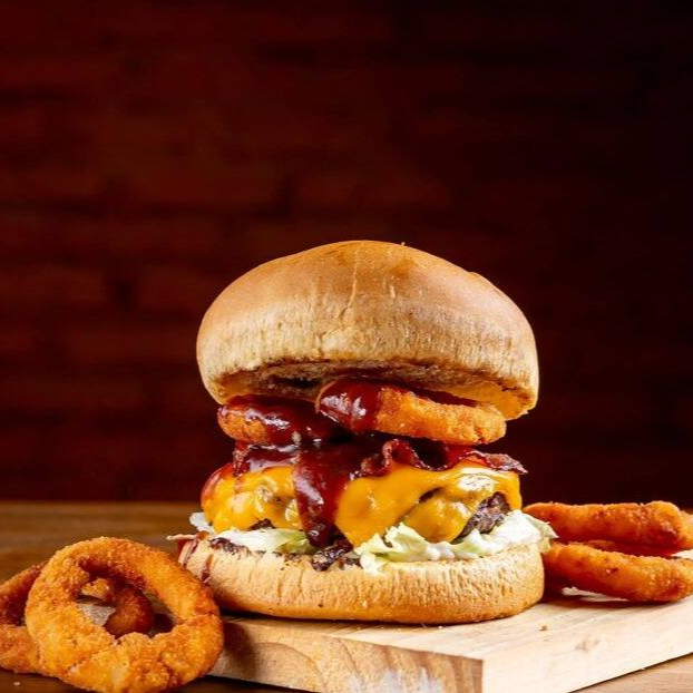 Pão brioche selado na brasa, carne bovina 150g, bacon, onion rings ao molho barbecue, queijo cheddar, alface americana e maionese defumada.