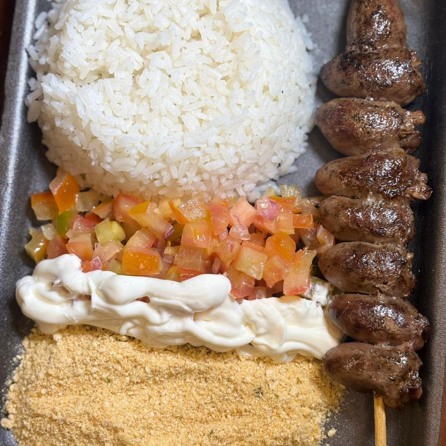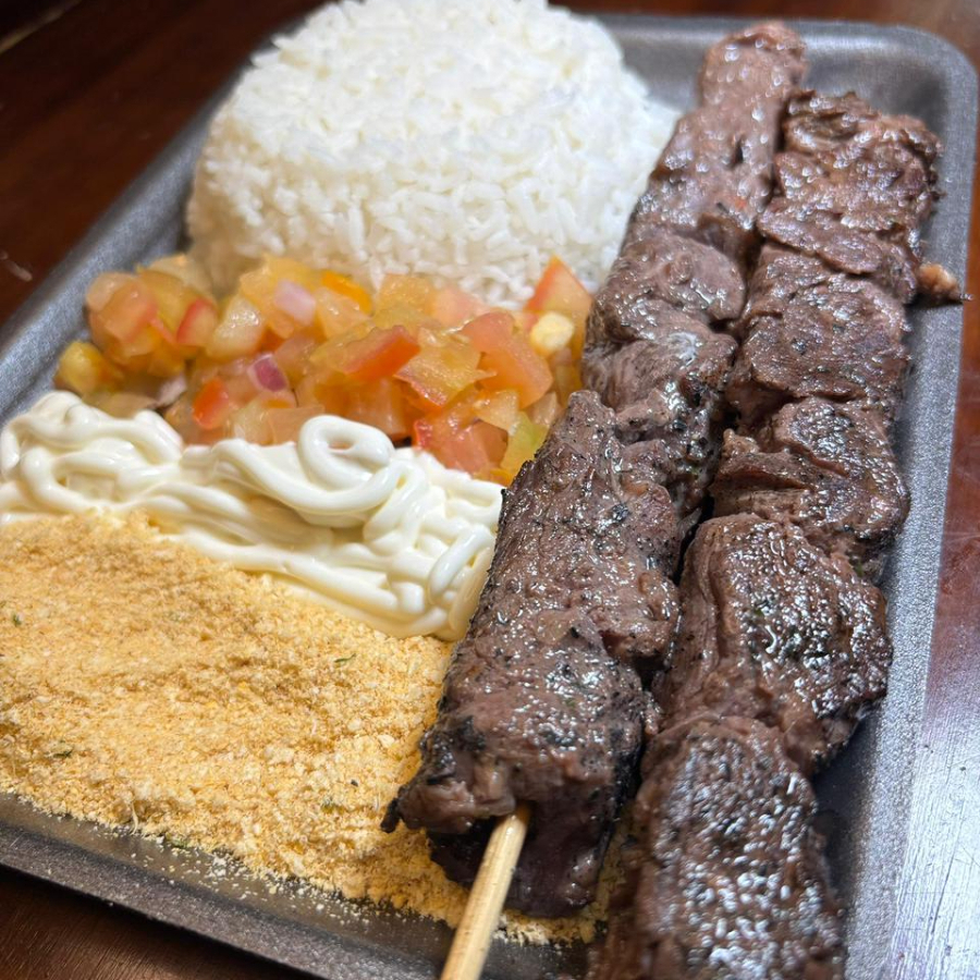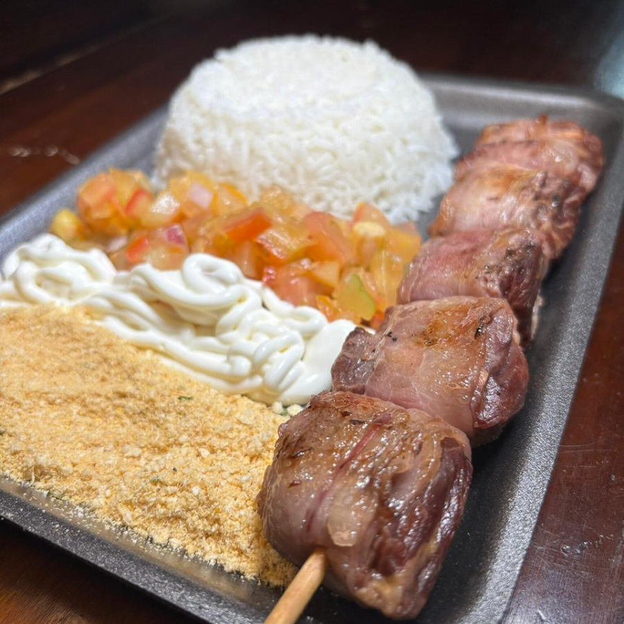 Arroz Branco Soltinho, vinagrete fresco, farofa temperada, maionese cremosa da casa, 1 espeto sucolento de carne grelada na brasa. Servindo quentinho e preparado na hora.